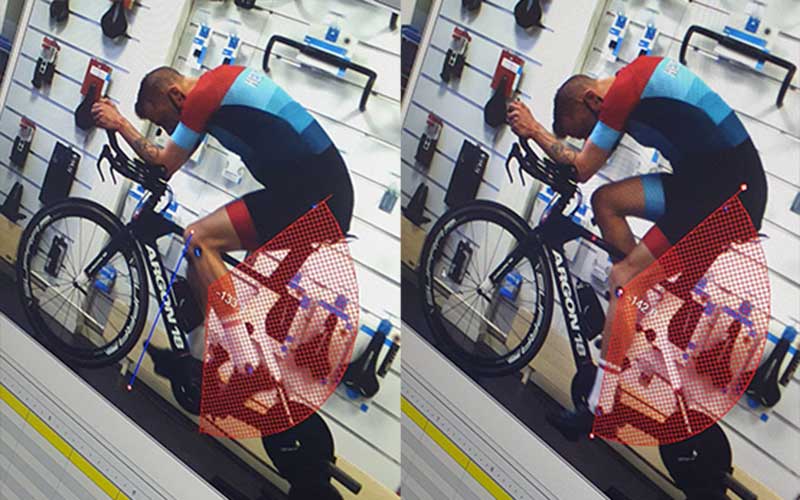 “De zadelterugstand vind ik mooi. Je kruipt tijdens het fietsen niet naar voren of naar achteren, dus daar ga ik niks aan veranderen,” vertelt Thomas. Maar hij wijst me wel op de hoek van mijn knie als mijn voet onderaan staat. “Die is nu 133 graden en dat mag een grotere hoek worden. Ik ga daarom je zadel hoger zetten. Je hoeft een minder grote cirkel met je bovenbeen te maken en daardoor kun je beter je kracht kwijt. Ook wordt je heuphoek geopend, waardoor je je heup minder afknelt.”